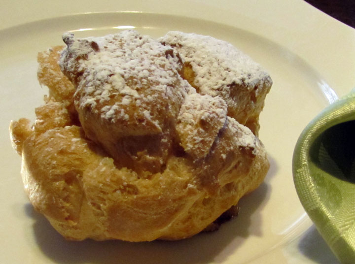 Heat oven to 400˚; heat water and butter to rolling boil in saucepan. Stir in flour. Stir vigorously over low heat until the mixture forms a ball. (about a minute) Remove from heat and beat in eggs all at once. Continue beating until smooth and thickened. (I use a wire whisk) Drop onto an ungreased cookie sheet about 3 inches apart. (a little less that ¼ cup batter for each) Bake until puffed and golden. 25 -40 minutes, depending on your oven. (just watch them) Cool. Cut off the tops and pull out any soft dough. (use a serrated bread knife) Fill puffs with cream filling. (2 big spoonfuls, they don’t have to be filled to the top) Replace tops and dust with powdered sugar. Refrigerate until serving.